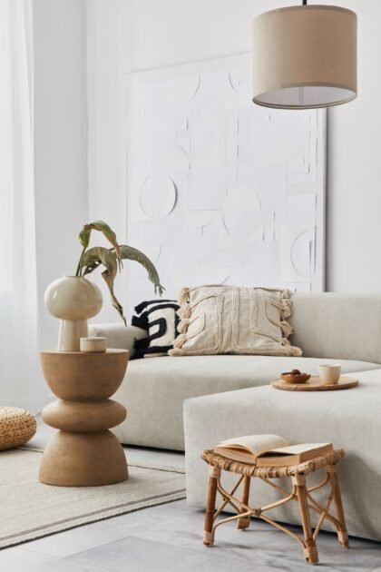 Living room interior with neutral sofa