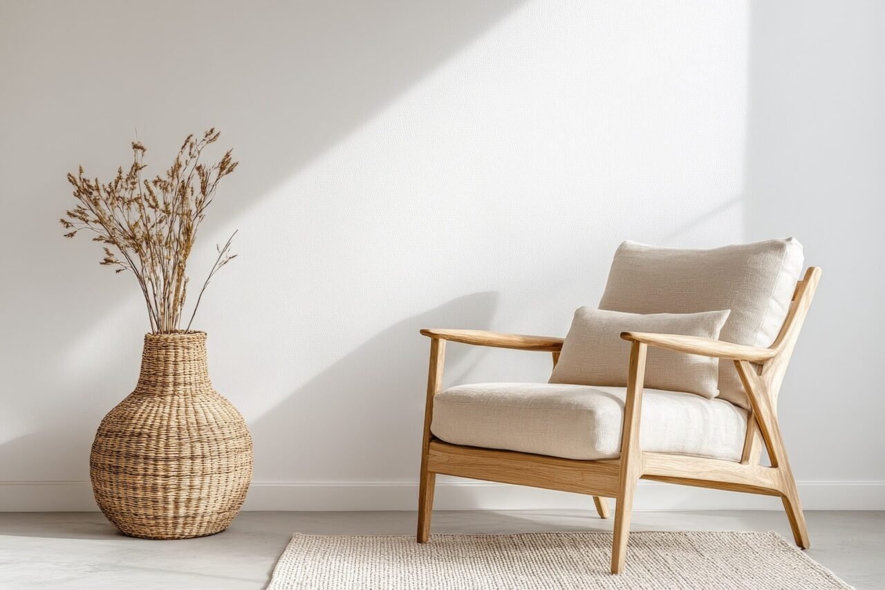 Living room interior with neutral sofa